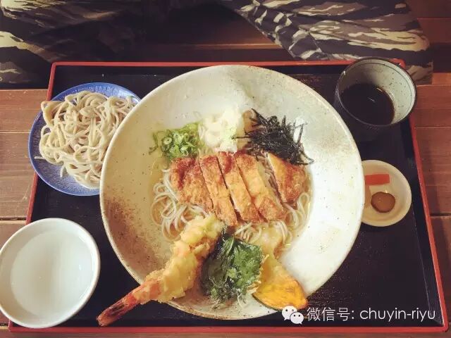 點上一份招牌的蕎麥面。兩種吃法,中間的大碗是炸豬排溫面,有湯的,湯很清爽。左邊的小盤的是冷的面,只需蘸著右邊的汁吃,面非常的有嚼勁面不會軟趴趴,配上他們特制的汁,真是一絕!