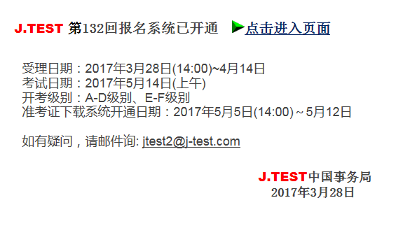 首頁 > 學(xué)校動態(tài) > 時間:J.TEST 第132回報名系統(tǒng)已開通 J.TEST 第132回考試點擊此處報名或登錄 有需要報名參加考試的同學(xué)趕緊報名起來吧! 附上報名地址哦:http://www.j-test.com/