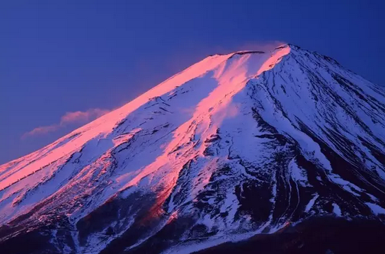 日出時(shí)富士山頂上的雪被朝霞染紅的紅富士